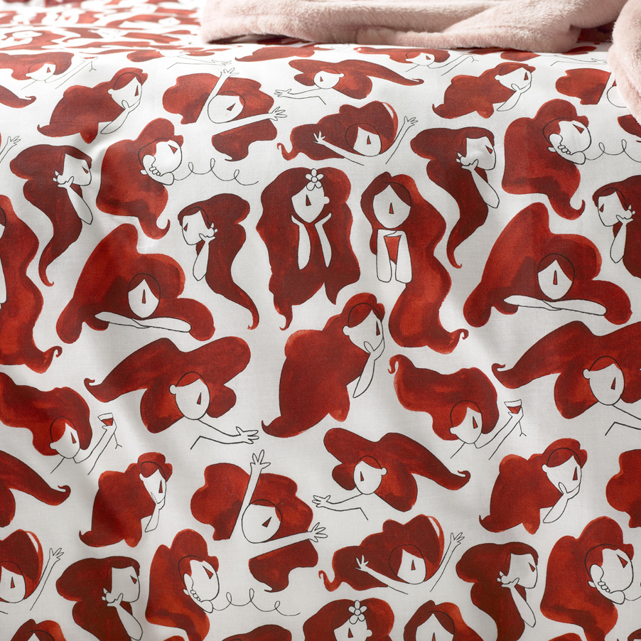 Dit stijlvolle hotelmaat dekbedovertrek uit de Odil-collectie van Moodit brengt direct warmte en karakter in de slaapkamer. Het dessin bestaat uit een herhalend patroon van elegante, illustratieve vrouwenfiguren met golvend rood haar, elk in een andere houding en stemming. De bijpassende kussenslopen sluiten naadloos aan bij het ontwerp en maakt het geheel compleet.