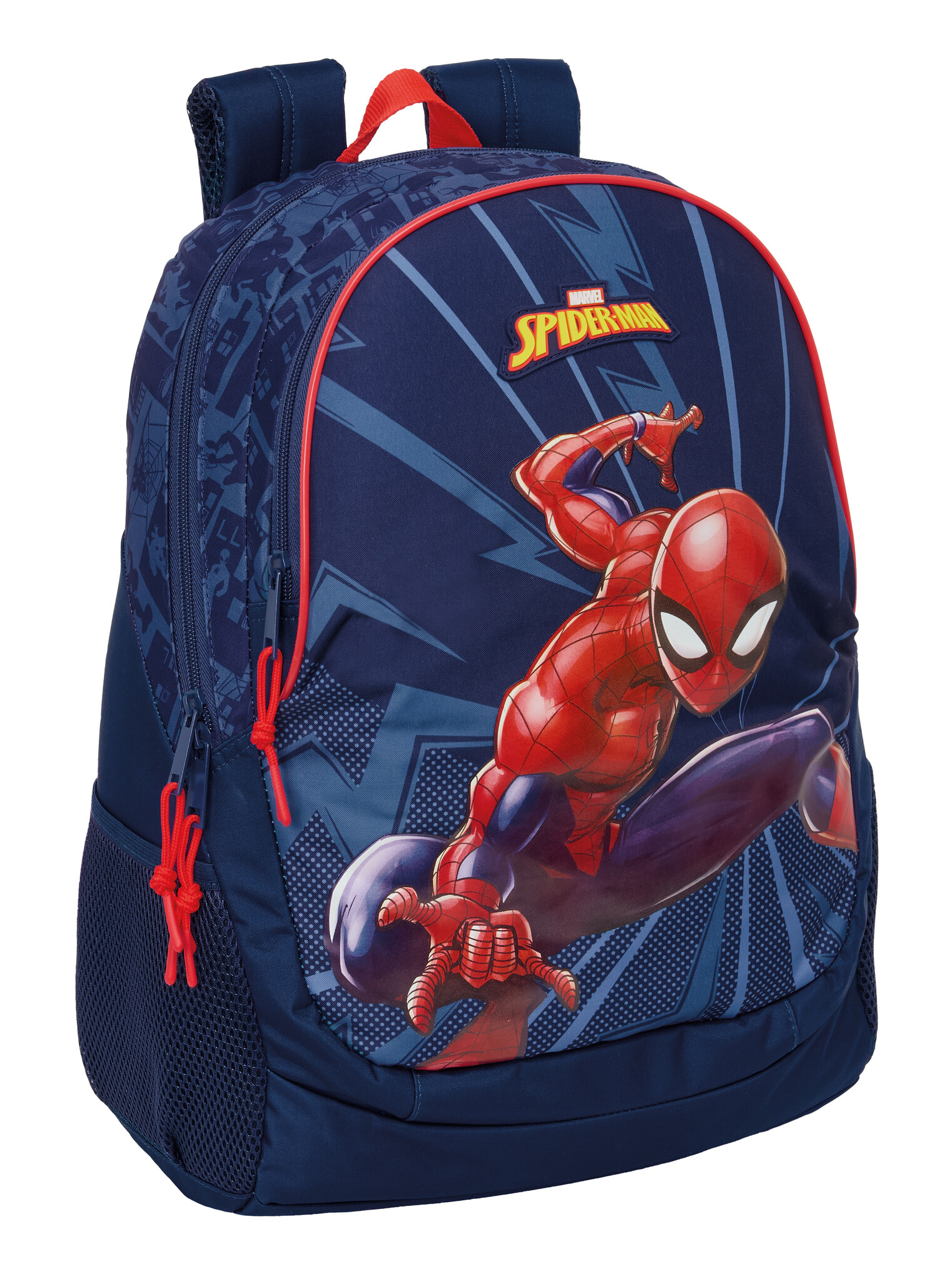 Das blaue Design zeigt auf der Vorderseite ein dynamisches Bild von Spider-Man in einer kraftvollen, actionreichen Pose, zusammen mit dem bekannten Spider-Man-Logo. Das verleiht dem Rucksack einen markanten und coolen Look , der perfekt zu echten Fans des Netzschwingenden Helden passt, der stets bereit ist, die Stadt zu beschützen.