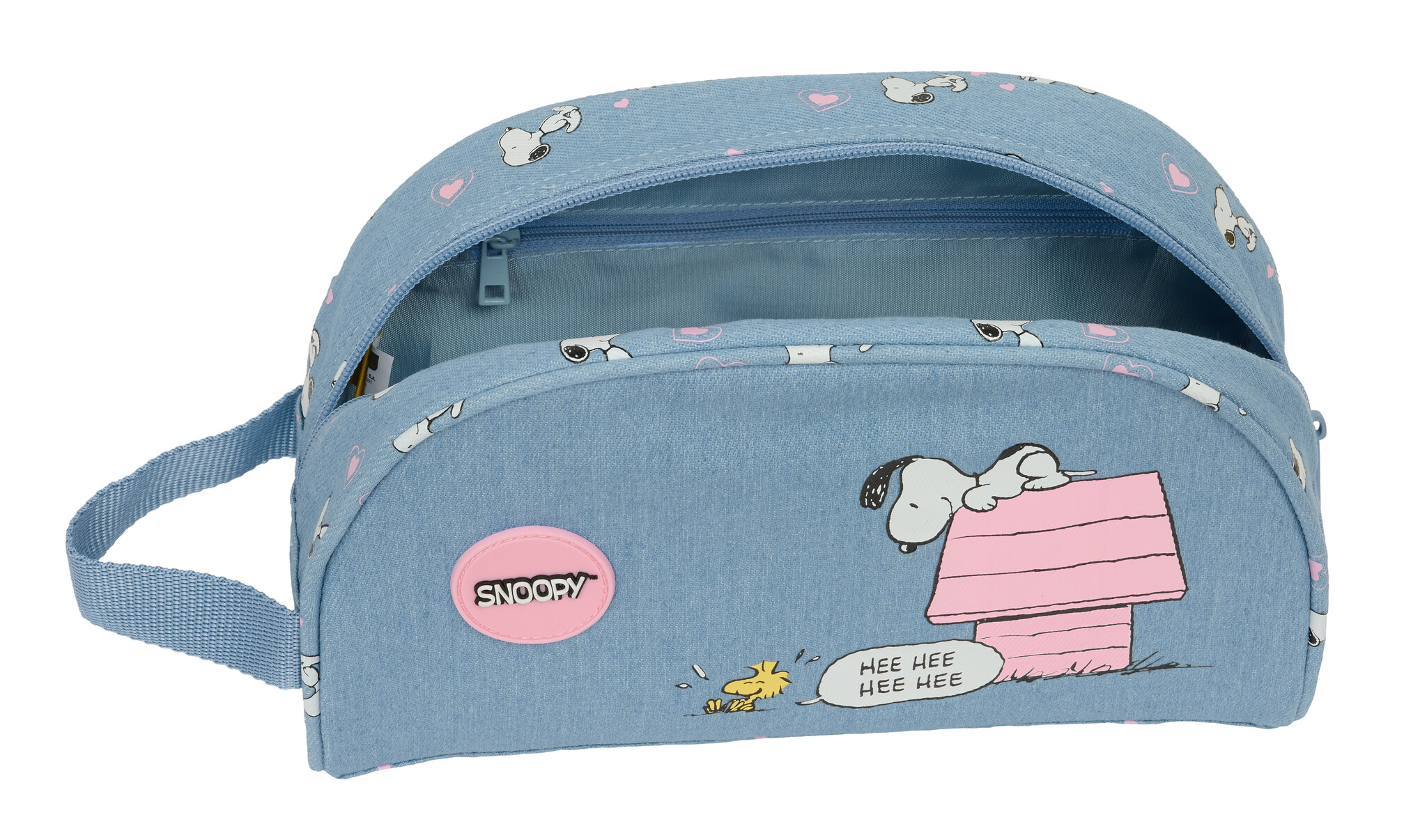 Dieser fröhliche blaue Snoopy-Kulturbeutel ist ideal für Kinder, die ihre Toilettenartikel ordentlich aufbewahren möchten. Der Beutel ist kompakt ( 26 cm breit, 16 cm hoch und 9 cm tief) und verfügt über ein geräumiges Reißverschlussfach . Auf der Vorderseite ist ein lustiges Bild von Snoopy zu sehen, der entspannt auf seiner Hundehütte sitzt und Woodstock schaut.