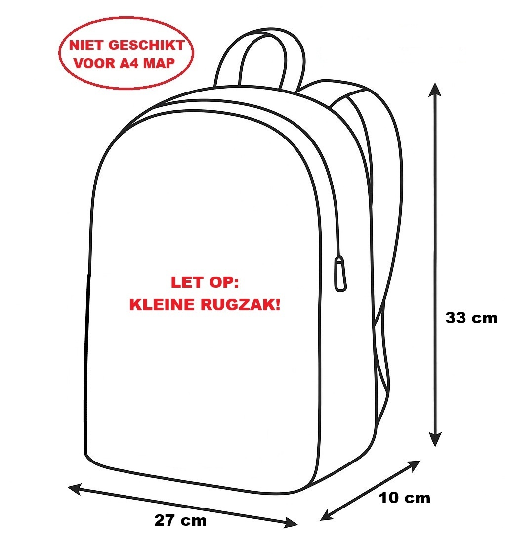 With dimensions of 33 x 27 x 10 cm and a capacity of 8.5 liters, this compact backpack is ideal for daily use. Although it is not suitable for A4 documents, there is enough room for a lunch, water bottle, and other small items. The zippered main compartment and the open side pocket make it easy to store everything neatly. The padded and adjustable shoulder straps ensure extra carrying comfort , and the name tag ensures you won't easily lose the bag.