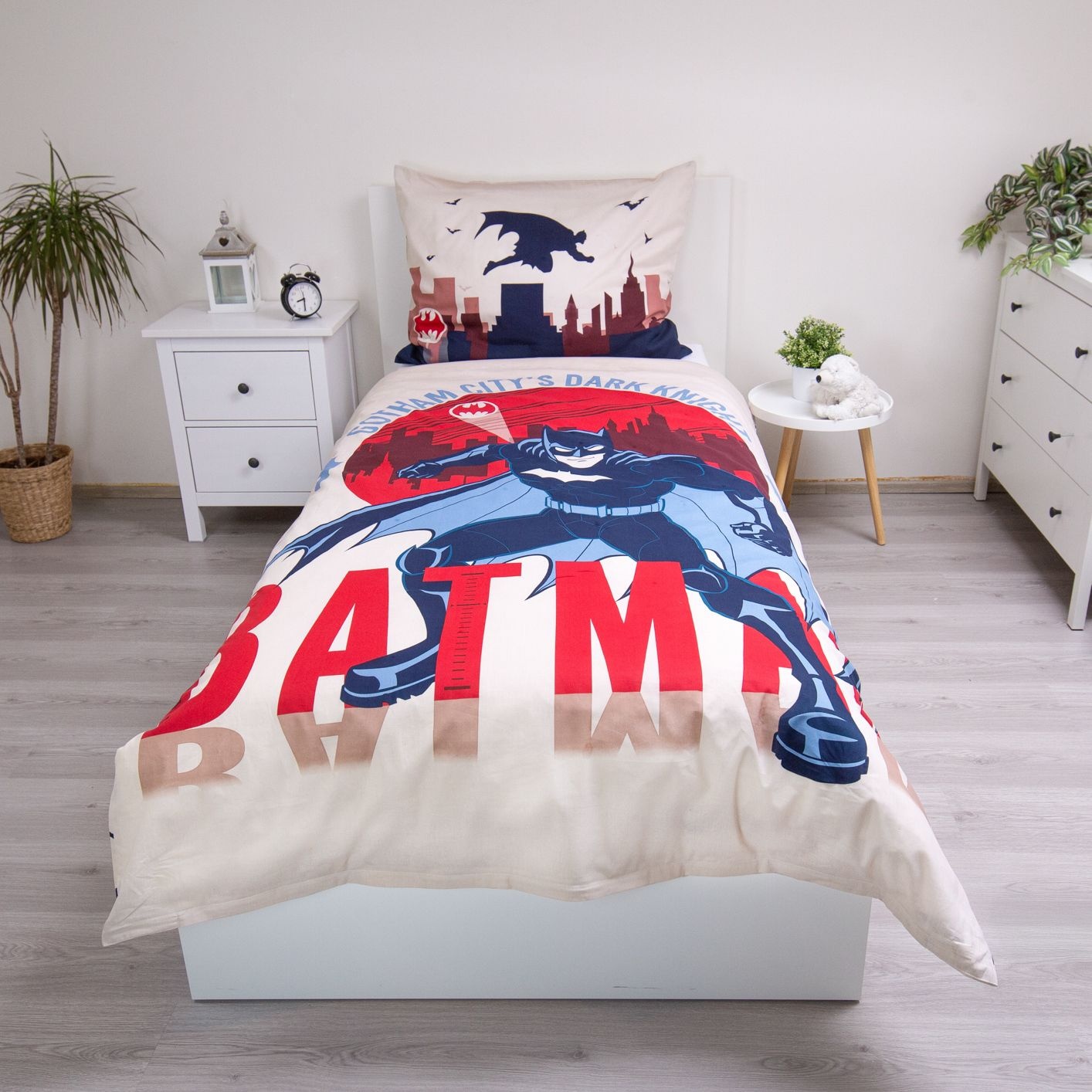 Bring Gotham City into your bedroom with this cool Batman single duvet cover . Made of soft, breathable cotton , it offers wonderful comfort all year round. The double-sided print adds a touch of fun: one side features Batman in action against the Gotham skyline, complete with the iconic Bat-Signal and swooping bats, while the other side features a playful pattern of silhouettes and the Batman logo. This allows you to effortlessly switch up your style. The set includes an extra-large 70 x 90 cm pillowcase , perfect for snuggling up. A perfect gift for young superheroes, Batman fans, or anyone looking to give their bedroom a cool, comic-book-inspired upgrade.