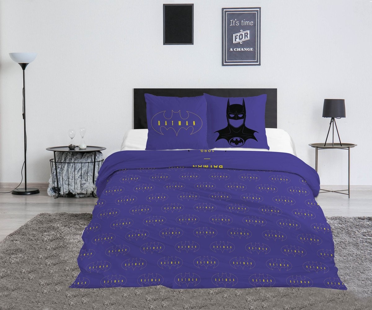 A wonderfully spacious duvet cover in Lits Jumeaux size featuring the popular superhero Batman. Batman, the iconic hero of all time. This polycotton duvet cover is extra large and features a striking print of Batman on a purple background. The cover and the 2 included pillowcases are reversible , allowing for variety when making the bed. A great gift idea for an upcoming birthday, the holidays, or just because for a true superhero or Batman fan!