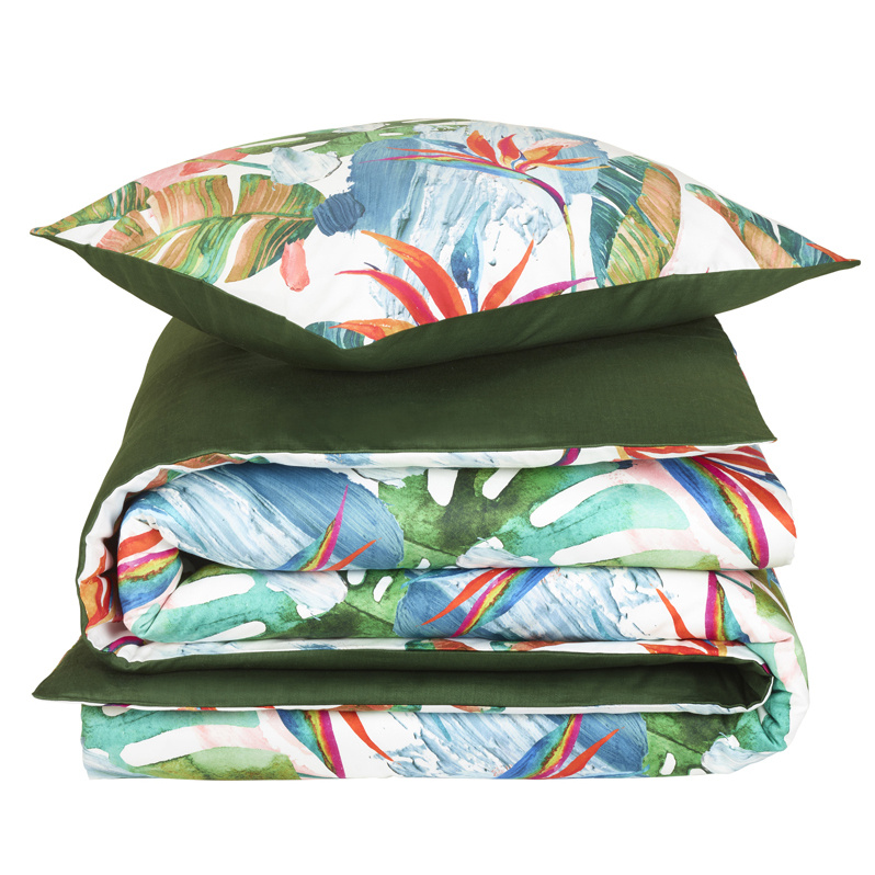 This duvet cover from De Witte Lietaer 's satin collection gives your bedroom a stylish, modern look with a hint of the tropics. The graphic design features dynamic leaves and flowers in deep shades of green, turquoise, and white, creating a playful yet tranquil overall look . The plain dark blue reverse and matching pillowcase add balance and refinement.