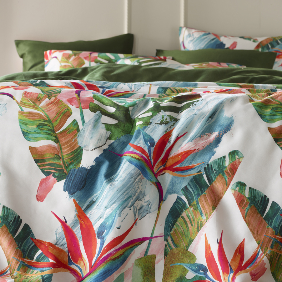 This duvet cover from De Witte Lietaer 's satin collection gives your bedroom a stylish, modern look with a hint of the tropics. The graphic design features dynamic leaves and flowers in deep shades of green, turquoise, and white, creating a playful yet calming overall look . The solid dark green reverse and matching pillowcases add balance and refinement.