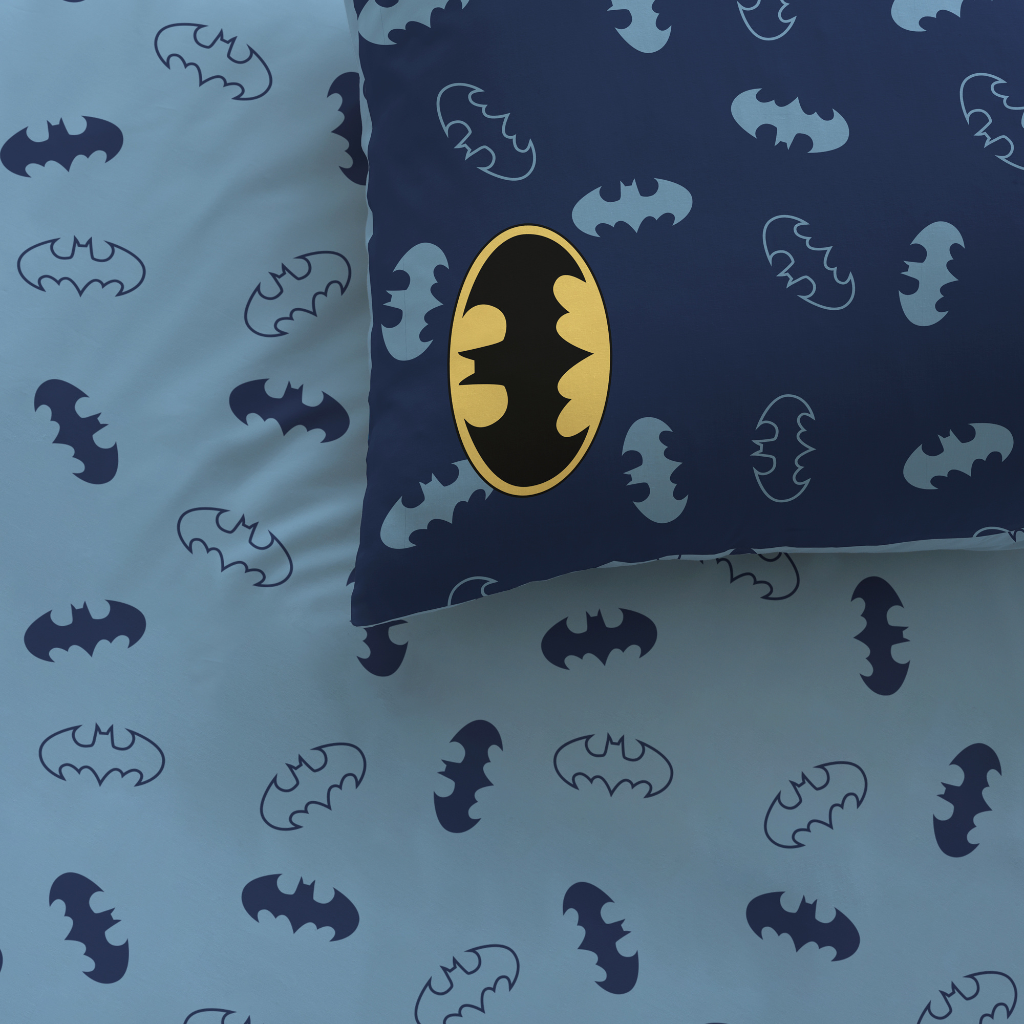 Batman Duvet Cover, Iconic. Tough duvet cover from Batman. This Lits Jumeaux duvet cover has a cool design of the Batman logo. A real statement for the bedroom! The cover is printed on both sides, which gives great options when making the bed. The set is completed by the two matching pillowcases. A great gift idea for a fan of this winged superhero for a birthday or the holidays!