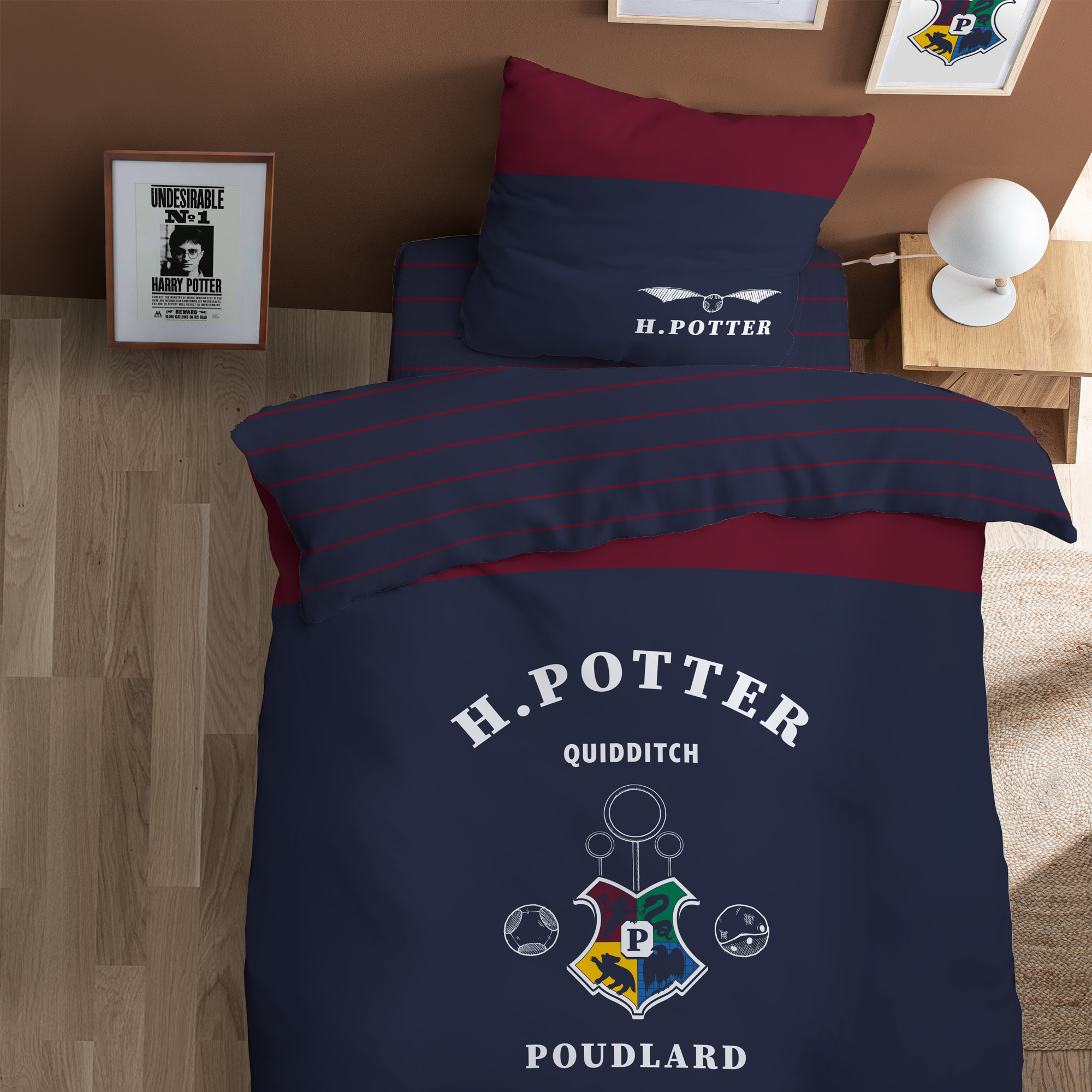 Harry Potter Duvet Cover, Stripe. Tough duvet cover from Harry Potter. Are you also a fan of the sport 'Quidditch' that is played in the Harry Potter films? Then this duvet is really something for you! Completely in the style of this tough sport and with the cool logo of Poudlard, also known as Hogwarts; the school of wizardry from the movies. The back of the cover has a sleek striped design, which gives nice options when making the bed. A great gift idea for any Harry Potter lover.
