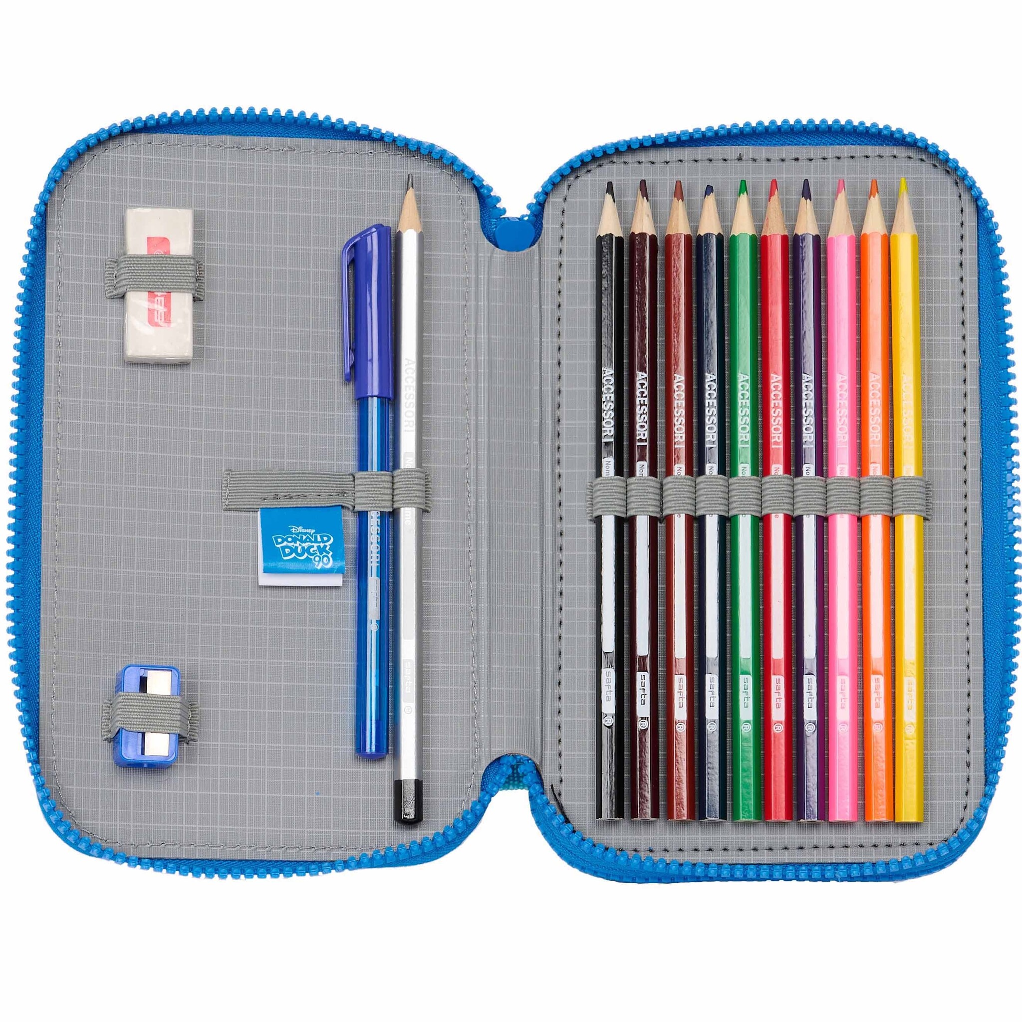 Donald Duck Filled Pencil Case, Navy. Nice blue pencil case from the always cheerful Donald Duck. Are you also a fan of this crazy duck? And are you a fan of drawing? Then this pencil case is a real must-have! Filled with various drawing supplies, such as felt-tip pens and colored pencils, you can make the most beautiful drawings. The case consists of two zippered compartments, keeping everything organized and neat. A perfect pencil case to take with you on holiday. Or use it at home or at school. Which Donald Duck fan will you make happy with this gift?