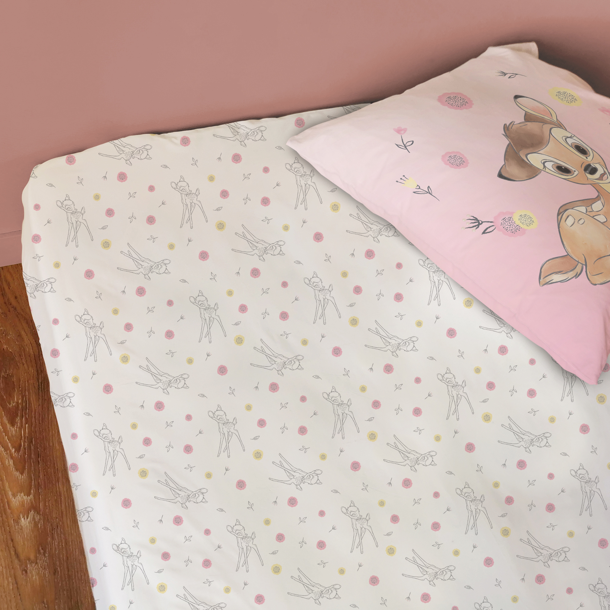Disney Bambi Fitted Sheet, Flower. Beautiful, cotton fitted sheet from Bambi; the famous deer from the Disney movies. Who didn't grow up with it? This cover is subtly decorated with images of Bambi, surrounded by flowers. Very suitable to combine with the matching duvet cover (sold separately).