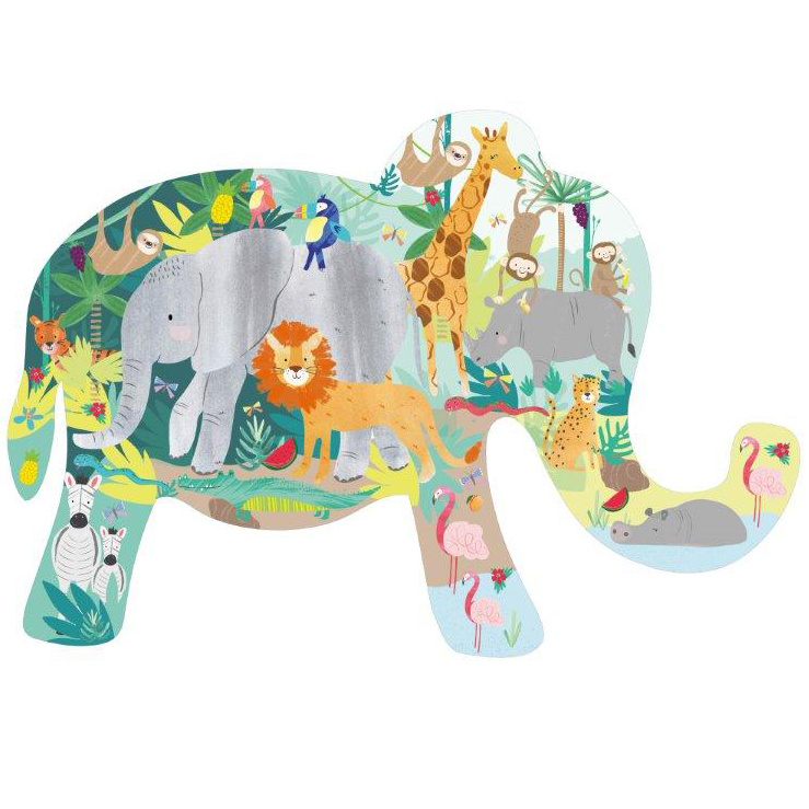 Floss & Rock Puzzle 40 pcs., Jungle. For animal lovers this is a great puzzle! The shape of the puzzle is an elephant and contains a jungle scene with all kinds of animals such as a lion, giraffe, flamingos and monkeys. A great gift for the novice puzzler. Making the puzzle promotes the development of the eye / hand coordination and trains the memory. Comes in a handy storage box.