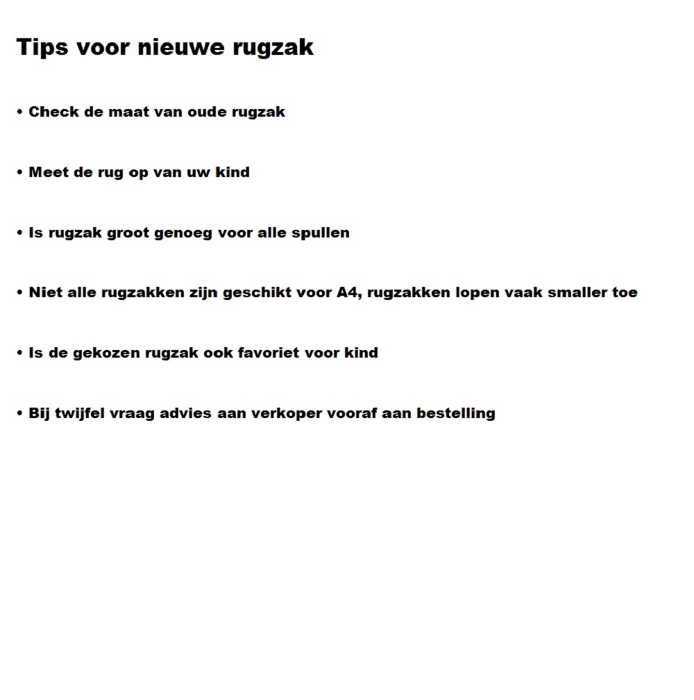 Please check the size you need before purchasing. A useful tip is to measure your child's back and compare it with the dimensions of the backpack. Also note that bags are often narrower at the top than at the bottom.