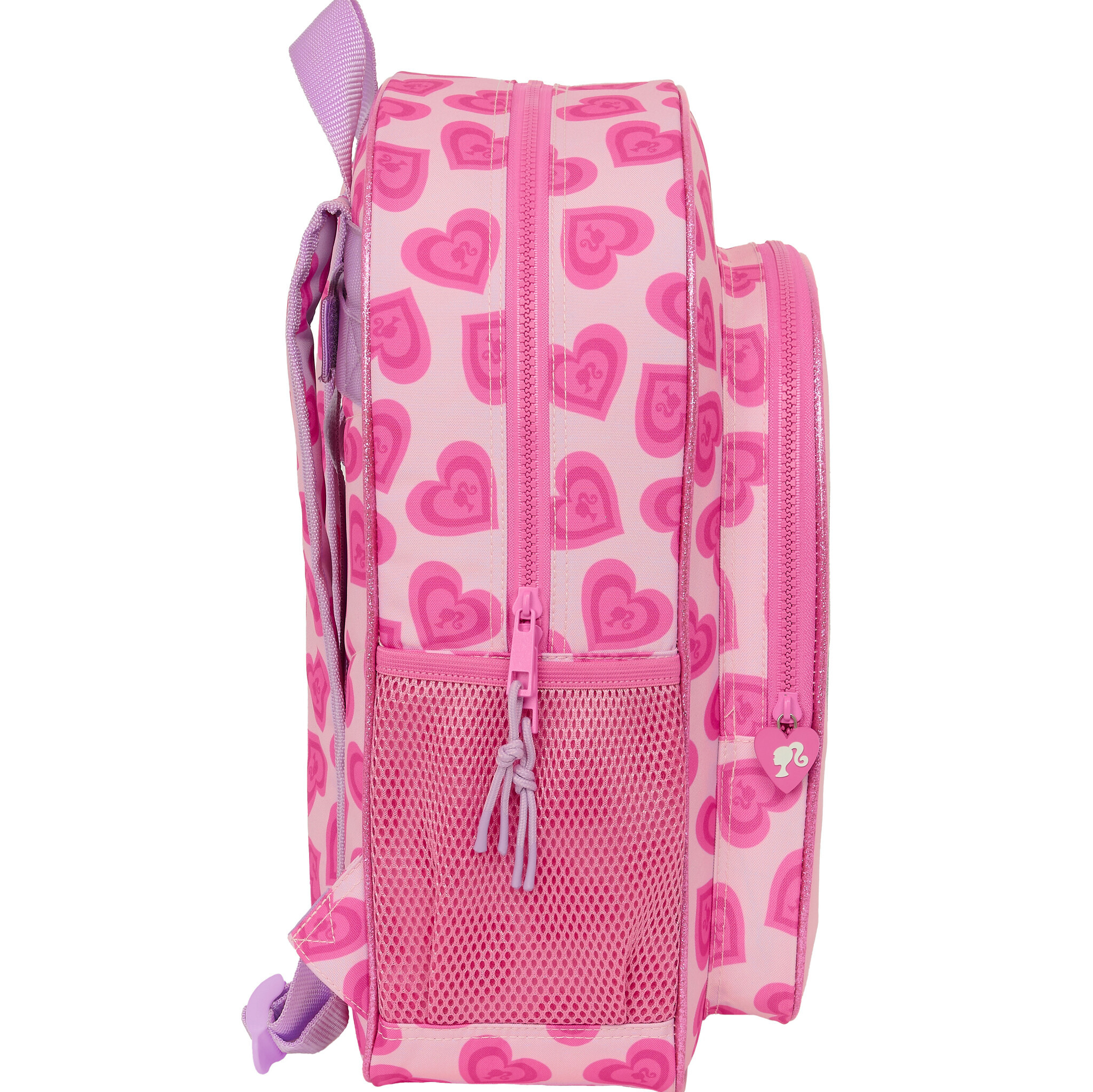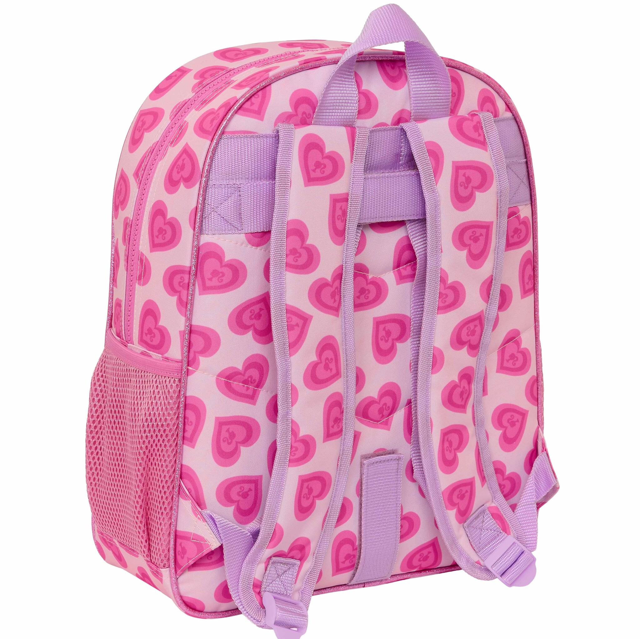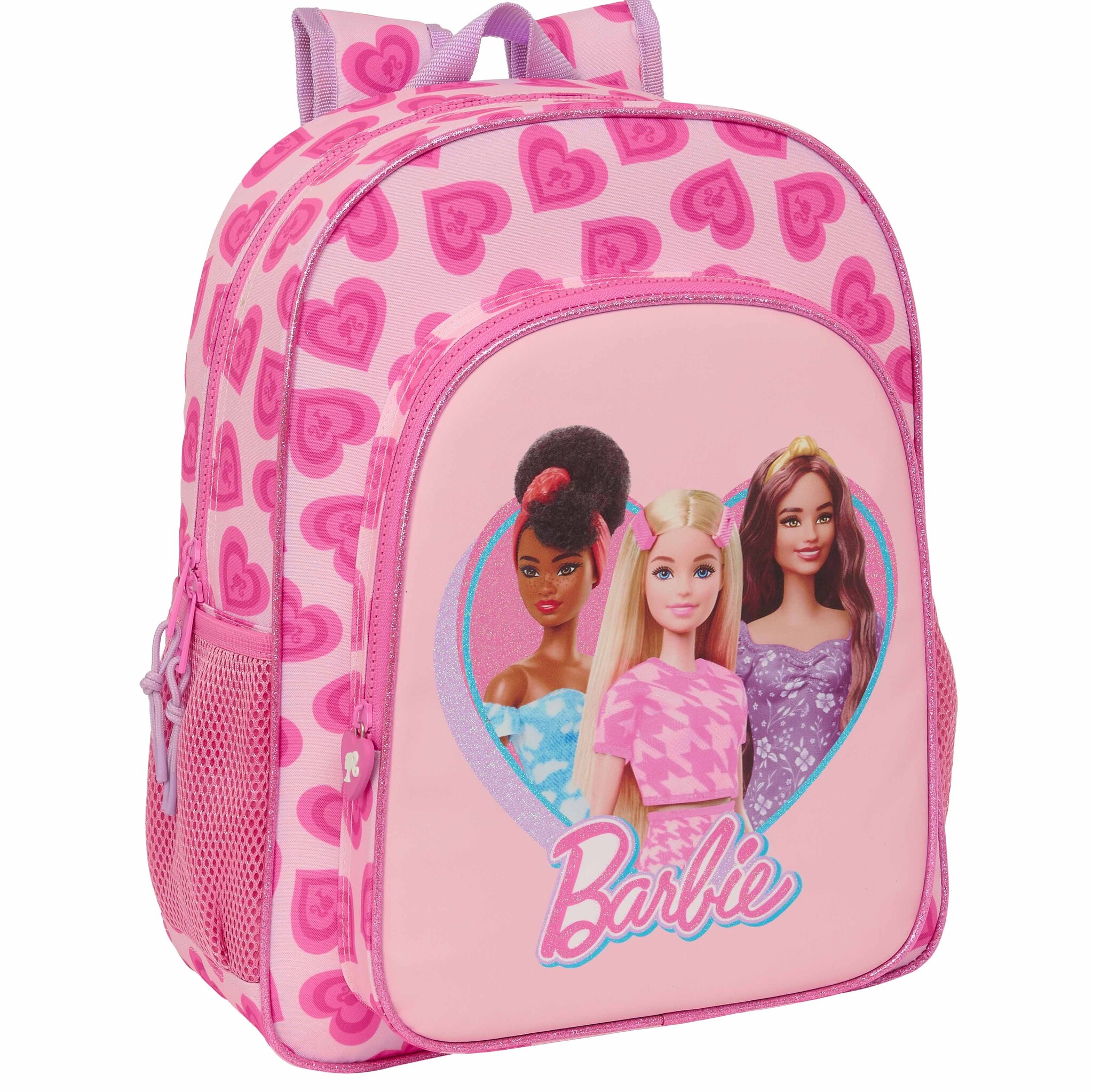 Barbie Backpack, Love. Nice backpack from Barbie. Barbie and her friends are surrounded by beautiful pink hearts. An amazing eye-catcher for the schoolyard! Did you also enjoy the latest Barbie movie? This bag has two spacious zippered compartments and two open side pockets, offering plenty of space for your school supplies. Also a perfect bag to take with you on a day out. In short; a beautiful and multifunctional bag for all Barbie fans!
