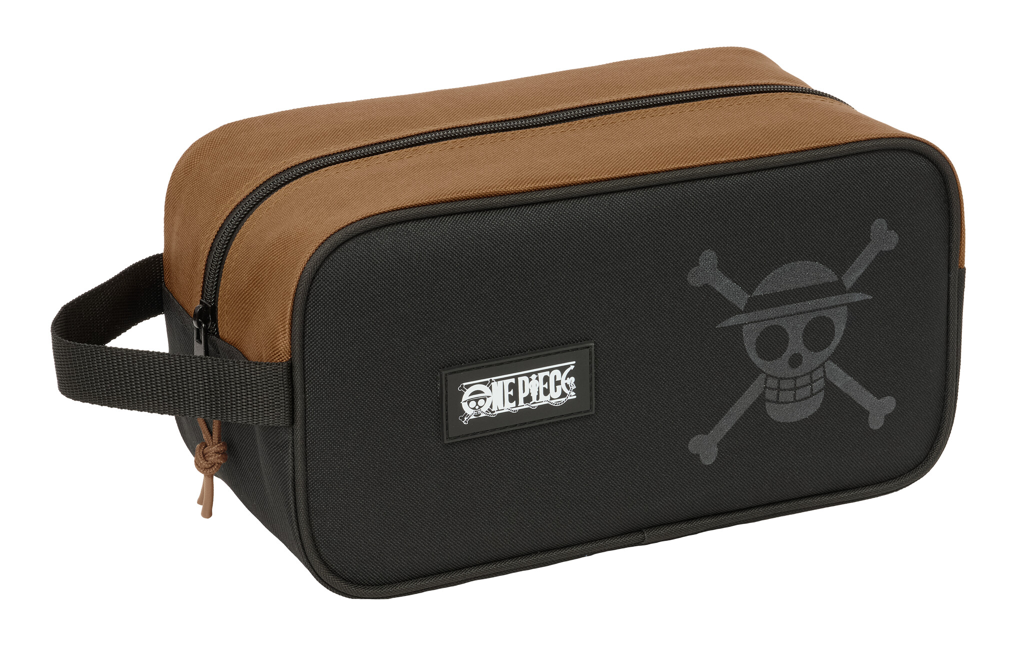 The design is bold and recognizable, executed in black with a brown top. The iconic One Piece logo and the well-known skull are featured on the front, making the bag stand out immediately.