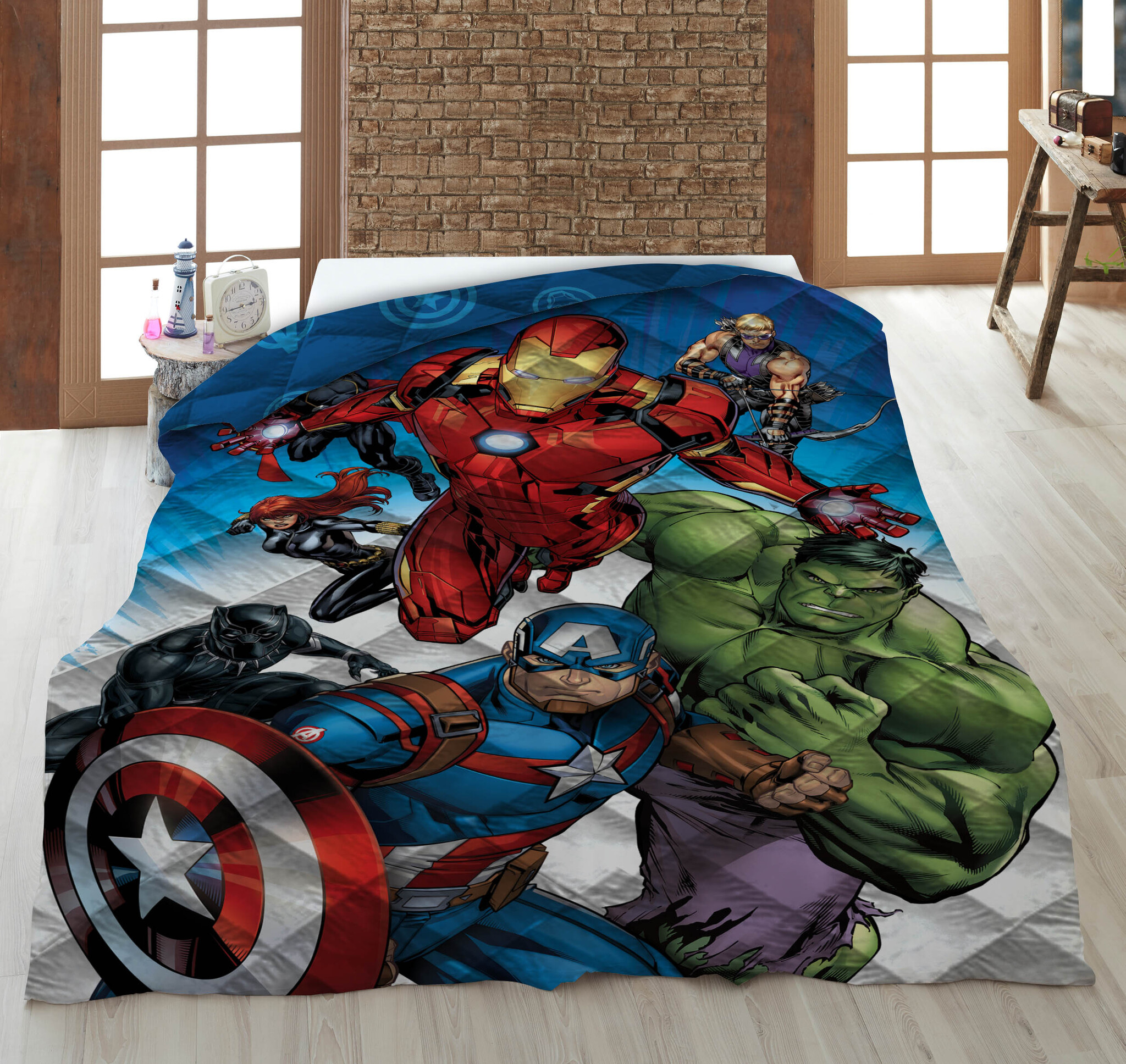 Snuggle under this cool Marvel Avengers bedspread and feel like a superhero! The bedspread features the most famous heroes from the Marvel universe, ready for action: Iron Man, Captain America, Thor, Hulk, Black Widow, Black Panther, and Hawkeye. Made of wonderfully soft polyester , it's double-sided, so it looks great on both sides. Perfect for snuggling up during movie night, as an extra blanket on the bed, or simply as a striking decoration in a child's room. Whether you dream of epic battles or just want to stay warm, this Avengers bedspread brings the power of the Marvel team right to your bedroom. Ready to transform your room into a superhero base? Assemble! It also makes a great gift idea for the holidays, a birthday, or just as a surprise for a true superhero fan!