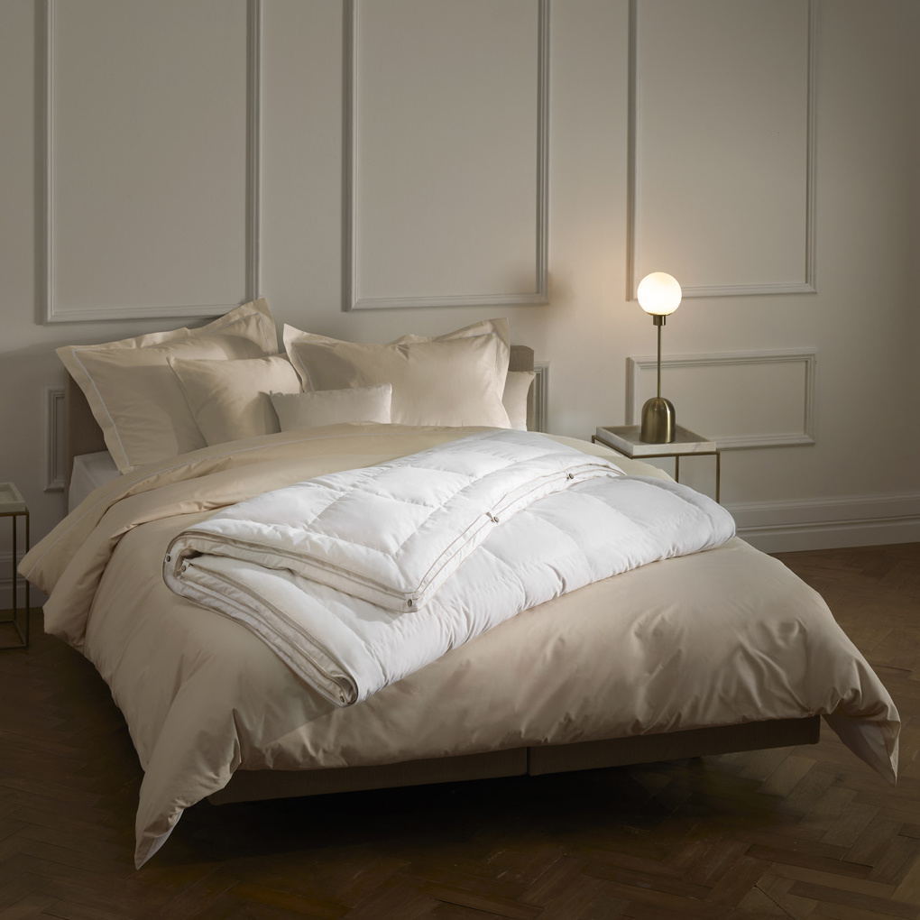 La housse 100 % satin de coton est d'une douceur incomparable. Son tissage haute densité prévient la perte de duvet et offre une protection supplémentaire contre les acariens. 100 % naturelle et fabriquée dans le respect des animaux , cette couette est livrée avec un sac de rangement pratique pour un entretien optimal.