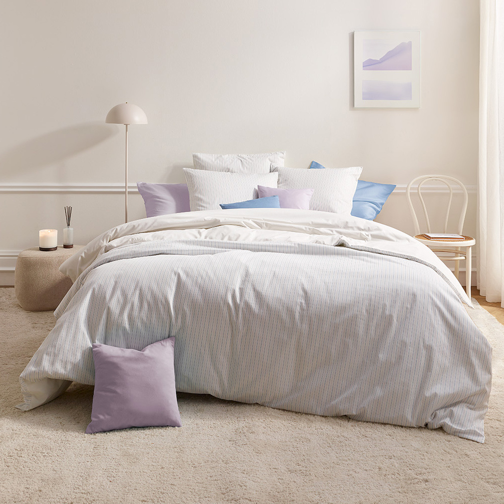 La housse de couette imprimée, ainsi que les taies d'oreiller, sont réversibles et peuvent donc être utilisées des deux côtés. Le devant présente un motif unique de fines rayures, tandis que le dos est uni, créant ainsi un effet luxueux.