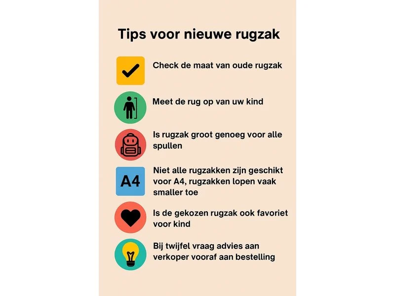 Vérifiez la taille nécessaire avant d'acheter. Un conseil pratique : mesurez le tour de dos de votre enfant et comparez-le aux dimensions du sac à dos. Notez également que les sacs sont souvent plus étroits en haut qu'en bas.