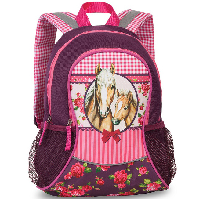 Sac à dos Fabrizio, Chevaux. Ce magnifique sac à dos violet et rose est parfait pour l'école ! Les amoureux des chevaux feront sensation avec ce sac. Il possède deux grands compartiments zippés et deux poches latérales ouvertes pour ranger des objets comme une bouteille d'eau. Un cadeau idéal pour tous les amoureux des chevaux !