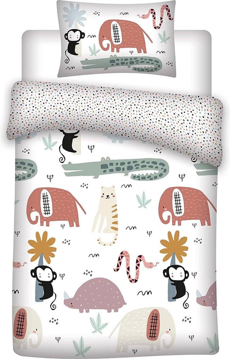 Naar bed gaan wordt een feestje met dit schattige baby dekbedovertrek in Jungle thema! De vrolijke print van olifantjes, krokodillen en aapjes geeft de kinderkamer direct een speelse uitstraling. De set is gemaakt van 100% katoen; ademend, zacht voor de gevoelige babyhuid en prettig in elk seizoen. Katoen neemt vocht goed op en zorgt ervoor dat je kleintje altijd comfortabel slaapt, of het nu warm of koel is in de kamer. Dankzij de hoogwaardige kwaliteit blijft de stof mooi, ook vaak na het wassen. Een veilige en knusse slaapplek, gecombineerd met een design dat de fantasie van je kind prikkelt. Dit dekbedovertrek is de perfecte mix van praktisch en betoverend. Een leuk cadeau voor een babyshower of het kraambezoek.