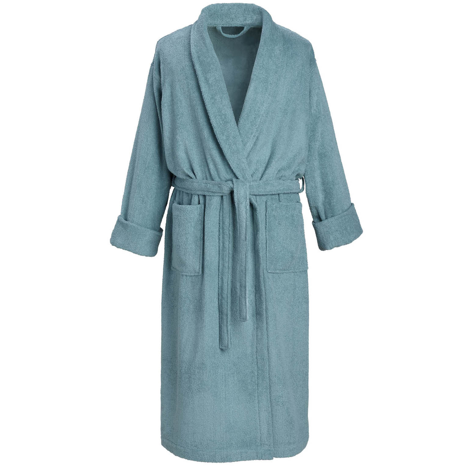 De shawlkraag, opgenaaide zakken en ceintuur geven de badjas een tijdloze, elegante uitstraling. Dankzij het 100% ademende katoen voelt hij prettig aan op de huid en blijft hij mooi, ook na veelvuldig wassen.