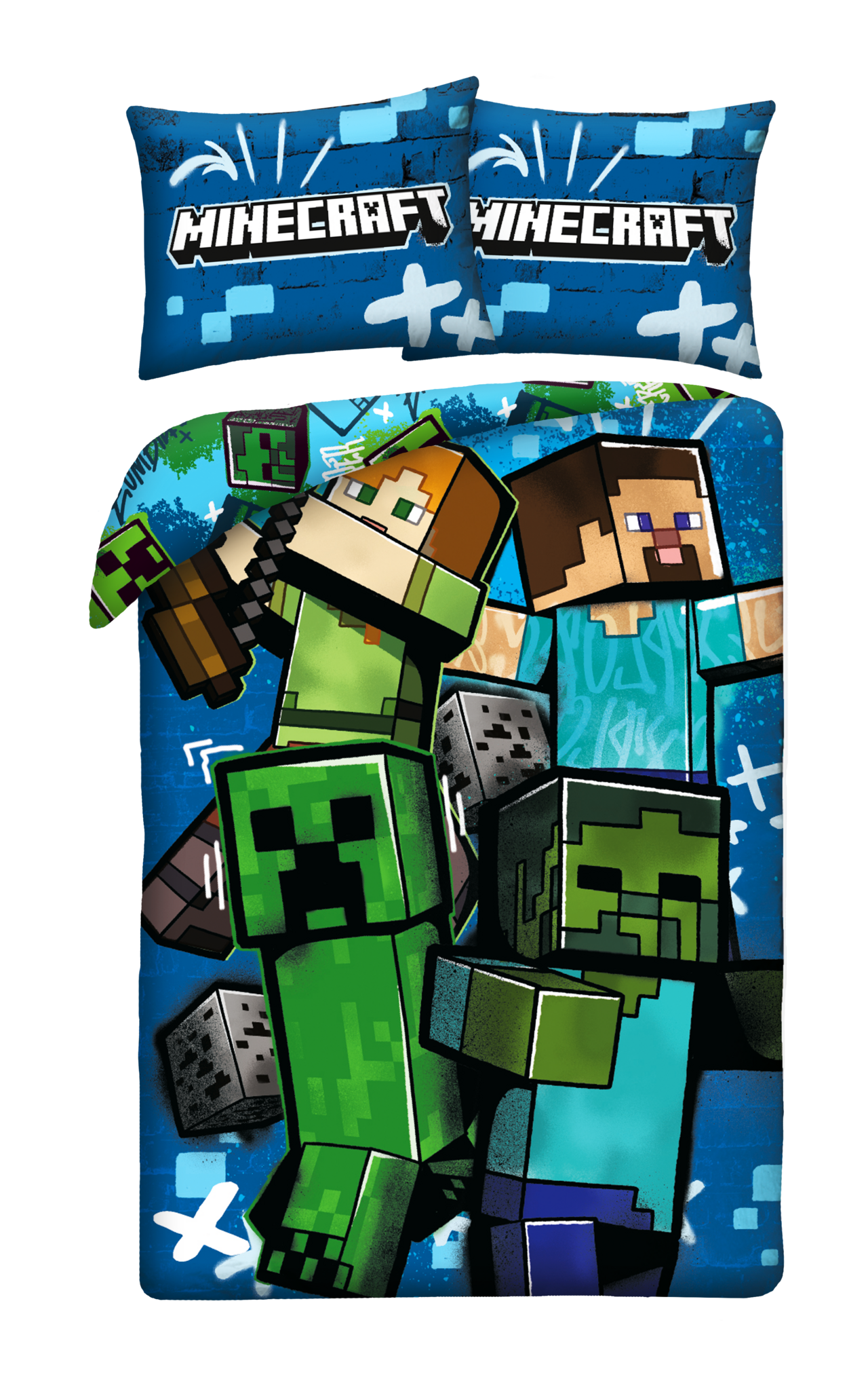 Breng de spannende wereld van Minecraft naar de slaapkamer met dit polyester dekbedovertrek. Op de voorkant staan Steve en Alex samen met een Creeper en een Zombie Creeper, klaar om elk avontuur in blokken te beleven, terwijl het extra grote kussensloop van 70 x 90 cm het iconische Minecraft-logo toont. De achterzijde van het overtrek heeft een afwijkend dessin, waardoor het omkeerbare design een frisse, verrassende twist geeft. Het zachte, duurzame polyester voelt comfortabel aan en behoudt de heldere kleuren, perfect voor elke jonge gamer die zijn liefde voor games ook in de slaapkamer wil laten zien. Dit dekbedovertrek is ideaal voor fans van Minecraft en een geweldig cadeau voor verjaardagen, feestdagen of om iemand te verrassen met een speelse en avontuurlijke touch. Zo wordt slapen een echt blokkenavontuur vol plezier en fantasie.