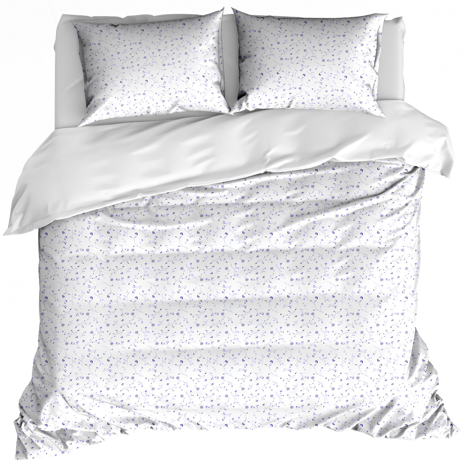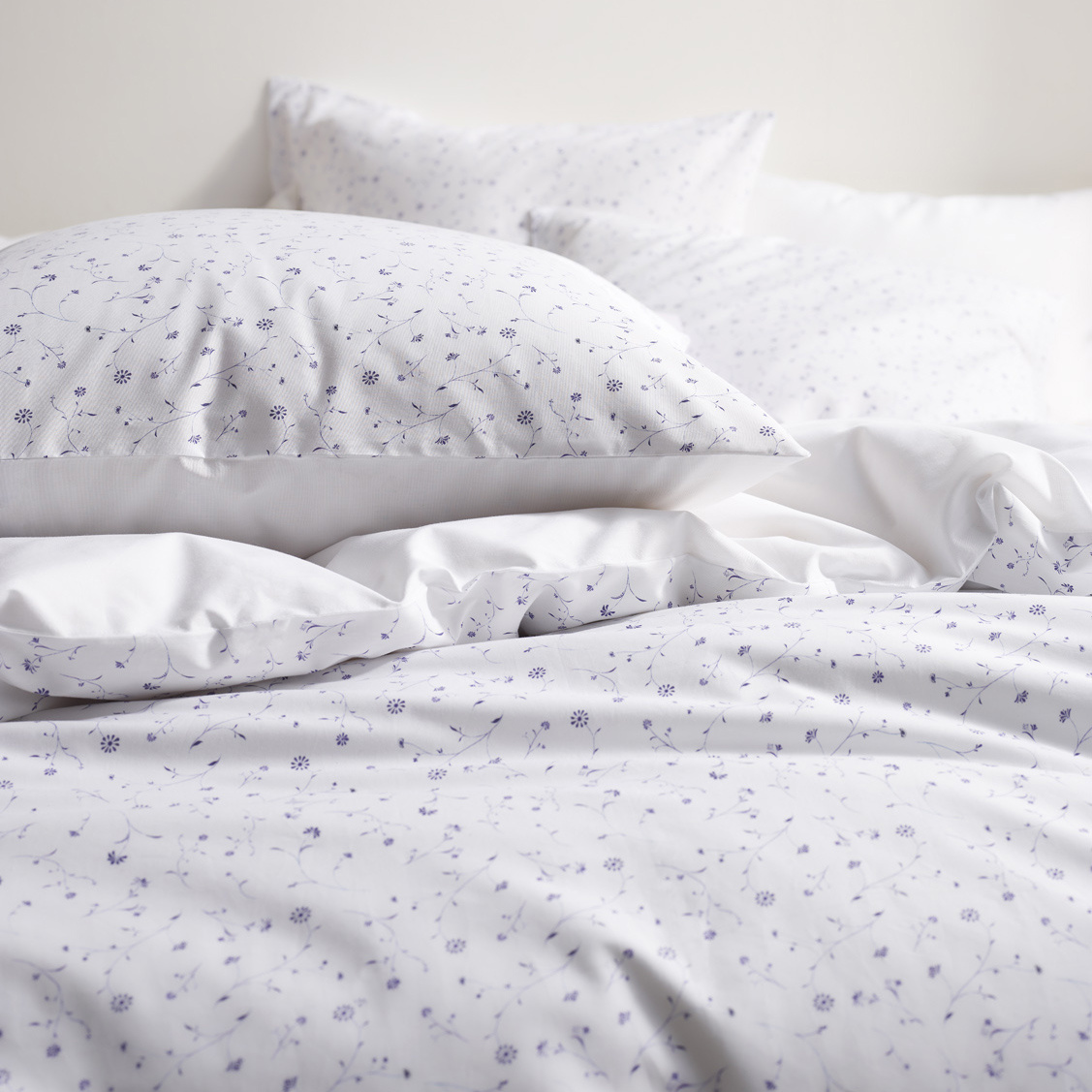 Het bedrukte dekbedovertrek, alsmede de kussenslopen, zijn dubbelzijdig en dus tweezijdig te gebruiken. De voorzijde heeft een uniek dessin van subtiele bloemetjes en de achterzijde een uni-kleur, wat een luxueus effect geeft.