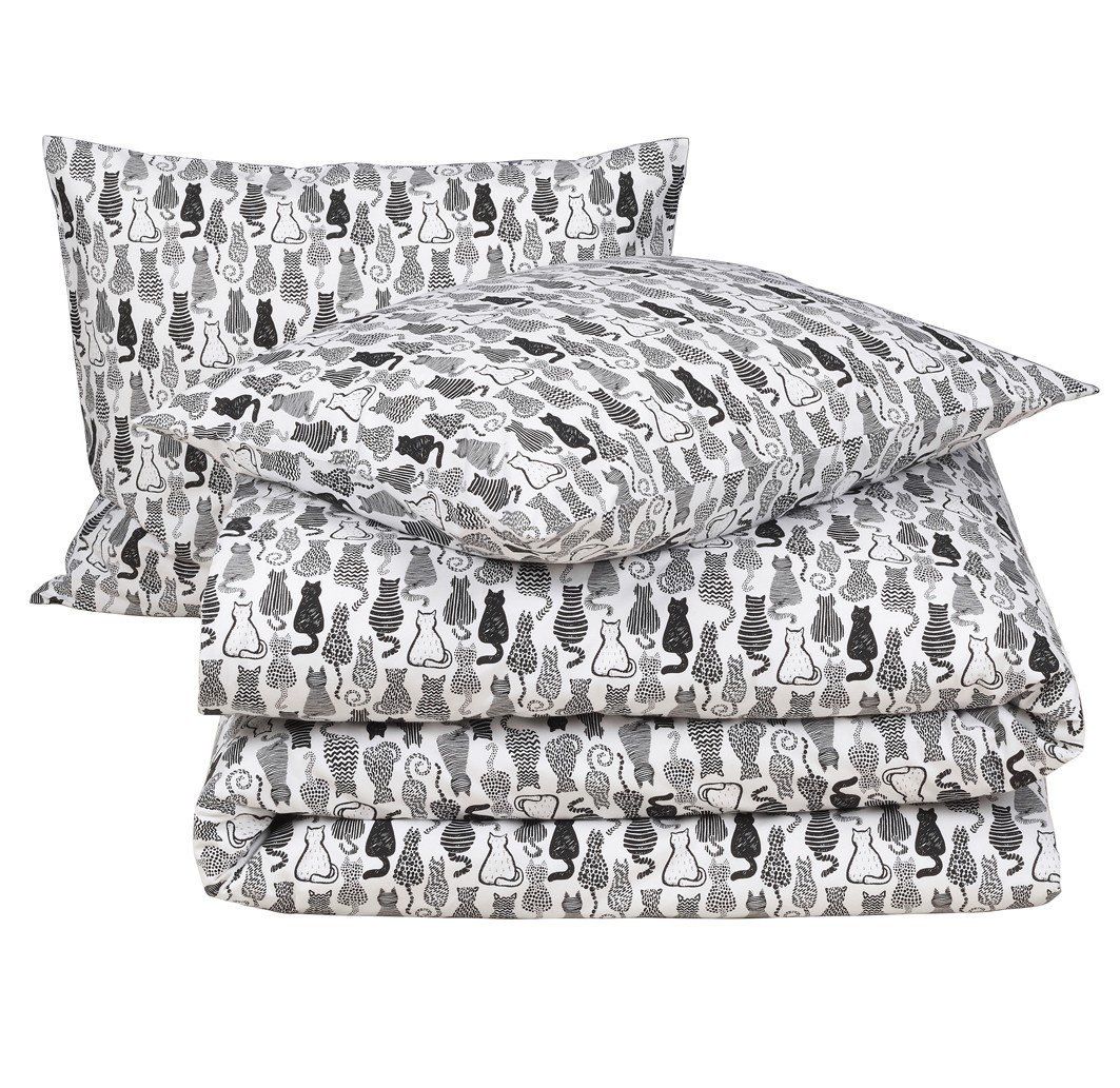 Dit stijlvolle lits jumeaux dekbedovertrek uit de Odil-collectie van Moodit brengt direct warmte en karakter in de slaapkamer. Het dessin bestaat uit een afwisselend dessin van zwart/witte katten op een frisse witte achtergrond, wat zorgt voor een levendige maar gebalanceerde uitstraling. De bijpassende kussenslopen sluiten naadloos aan bij het ontwerp en maakt het geheel compleet.