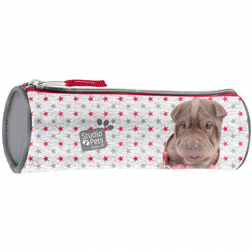 Studio Pets Rond Etui Shar-Pei. Dit etui is een handige opruimplek voor potloden en pennen en het ziet er ook nog super leuk uit. Op beide kanten is een hond (ras: Shar-Pei) afgebeeld met op de ene kant een achtergrond met grijze en rode sterren en op de andere zijde staat het woord "Music" er bij. Een praktisch EN leuk cadeau!