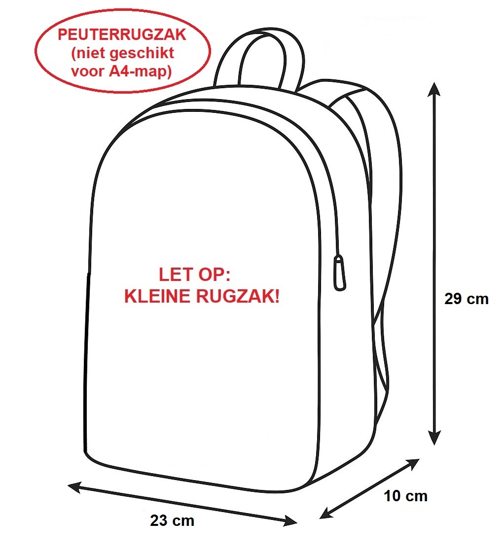 Controleer voor de aankoop de maat die u nodig heeft. Een handige tip is om de rug van uw kind op te meten en te vergelijken met de afmetingen van de rugzak. Let ook op dat tassen aan de bovenkant vaak smaller zijn dan aan de onderkant.