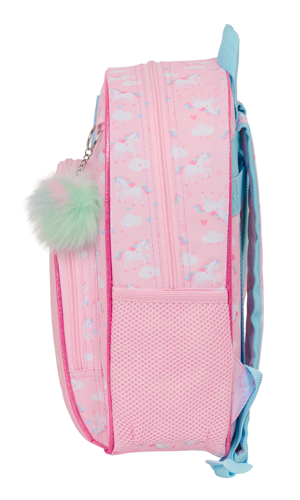 Laat elke dag een beetje magisch aanvoelen met deze schattige roze rugtas! Op het voorvak staat een vrolijke eenhoorn die over een regenboog springt, terwijl de rest van de tas is versierd met een speels patroon van kleine eenhoorns.