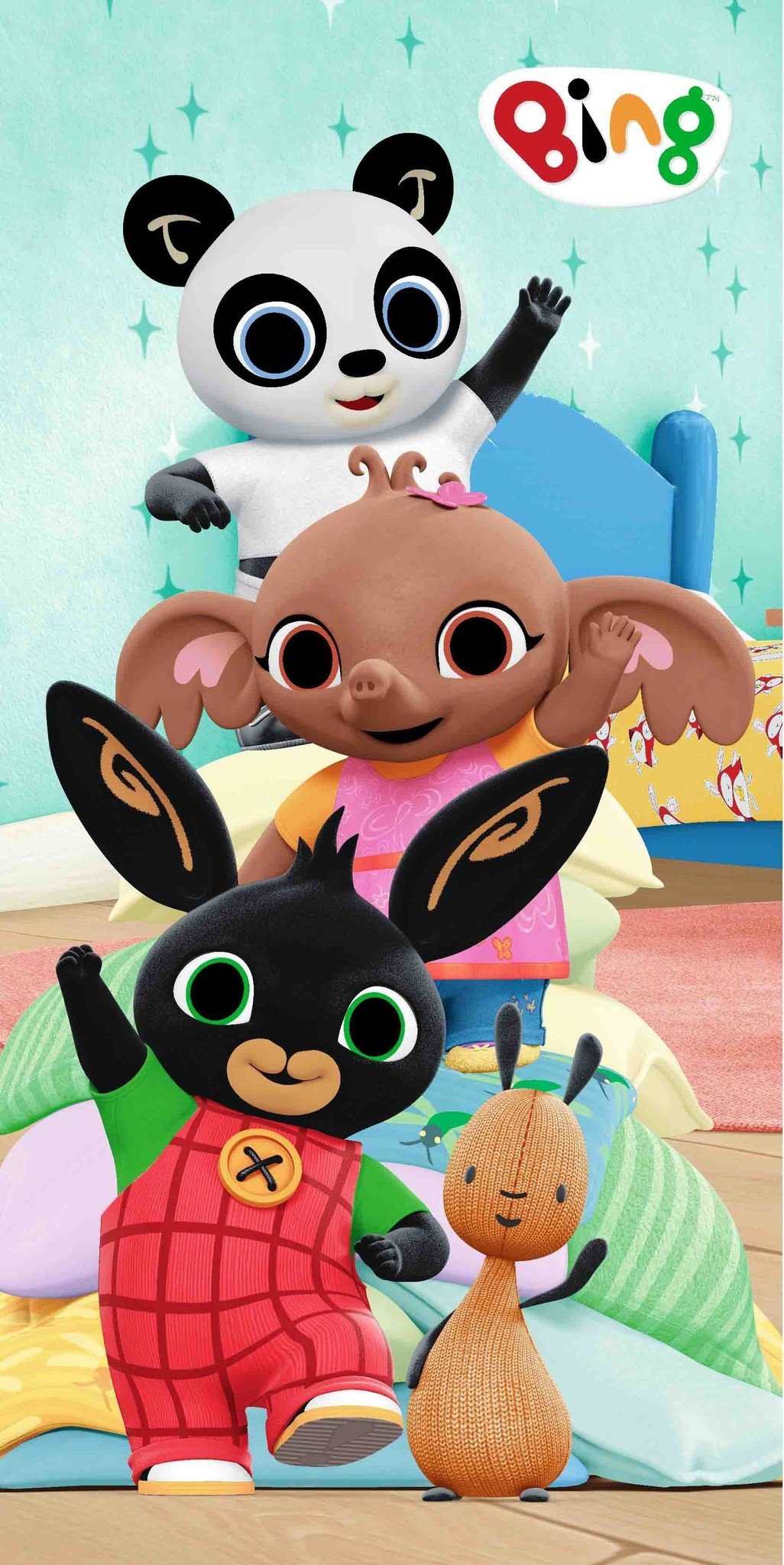Bing Bunny Strandlaken, Friends. Bing, Flop, Pando en Sula kunnen het altijd met elkaar vinden! Samen hebben ze het grootste plezier, doe jij met ze mee? Dit strandlaken is bij uitstek geschikt voor de grootste Bing Bunny fans.